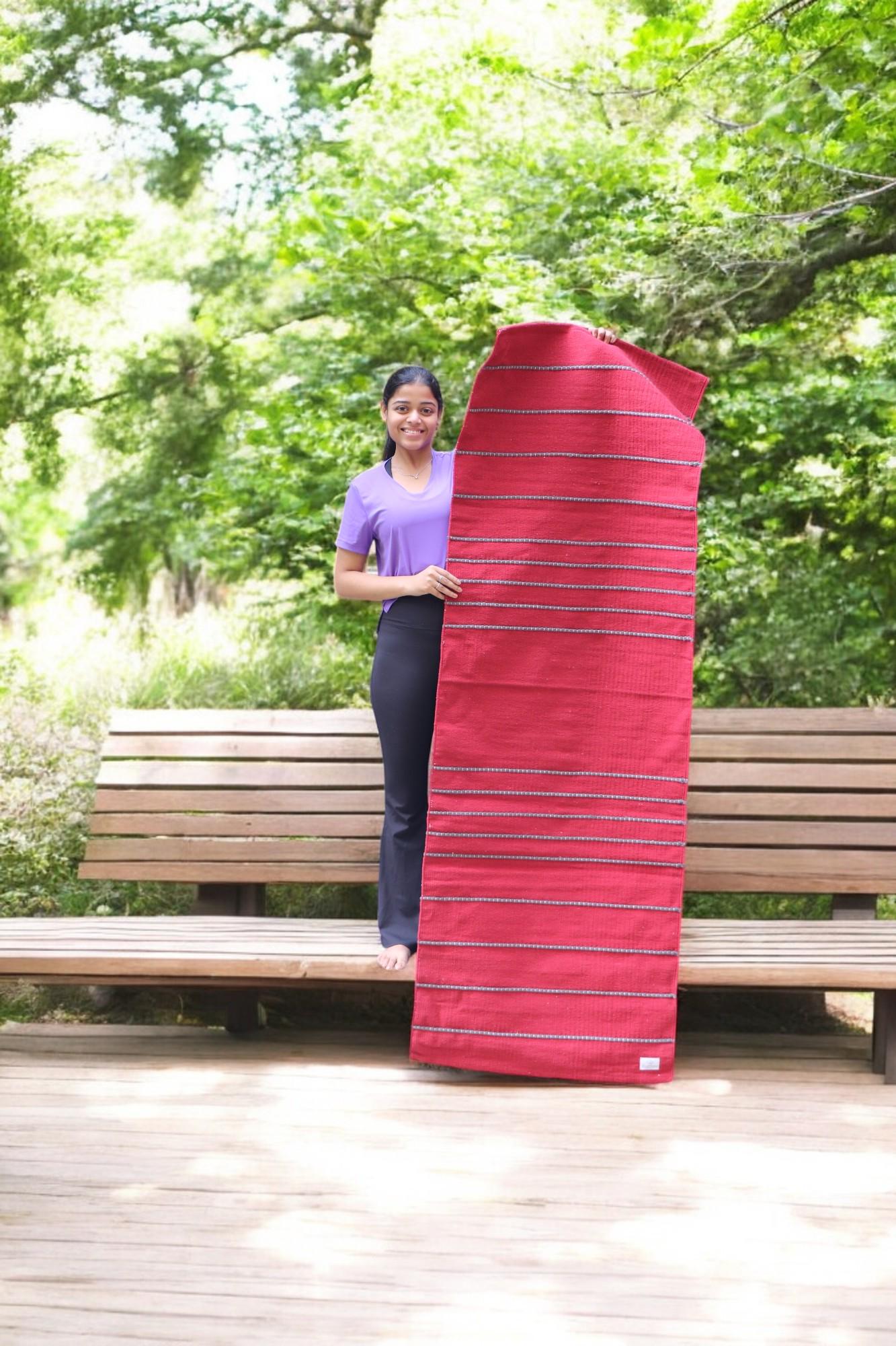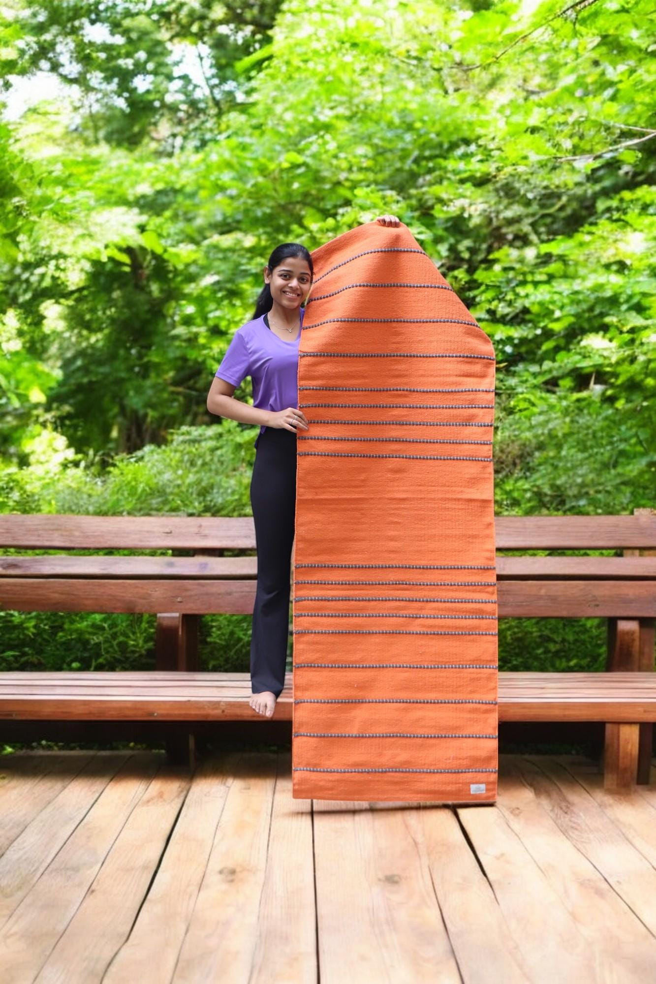 Product | Bright Orange / Red Organic Cotton Yoga Mat — Handwoven with Black Grip Stripes |