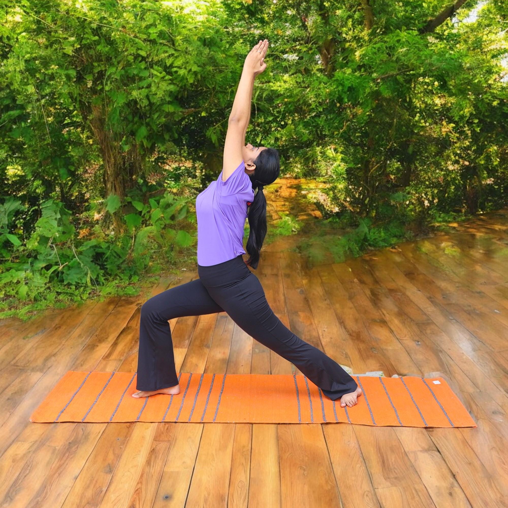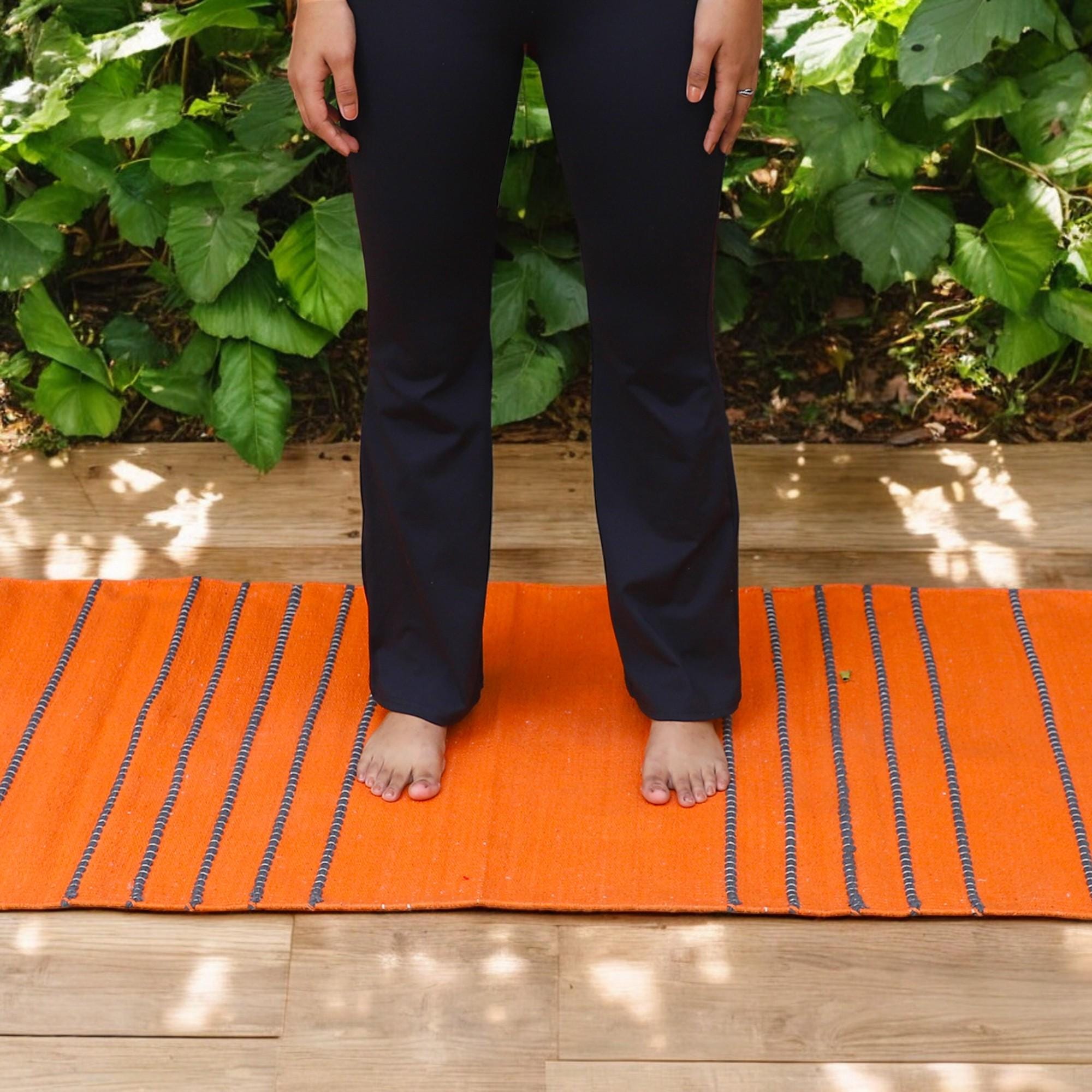Infuse your practice with color and tradition. The Bright Organic Cotton Yoga Mat is handwoven over three days by our partner artisans in India, using pure cotton yarns and black knotted grip stripes that add traction and texture. The vibrant hue—available in Bright Orange or Red—awakens warmth and focus, turning your practice into a celebration of vitality.