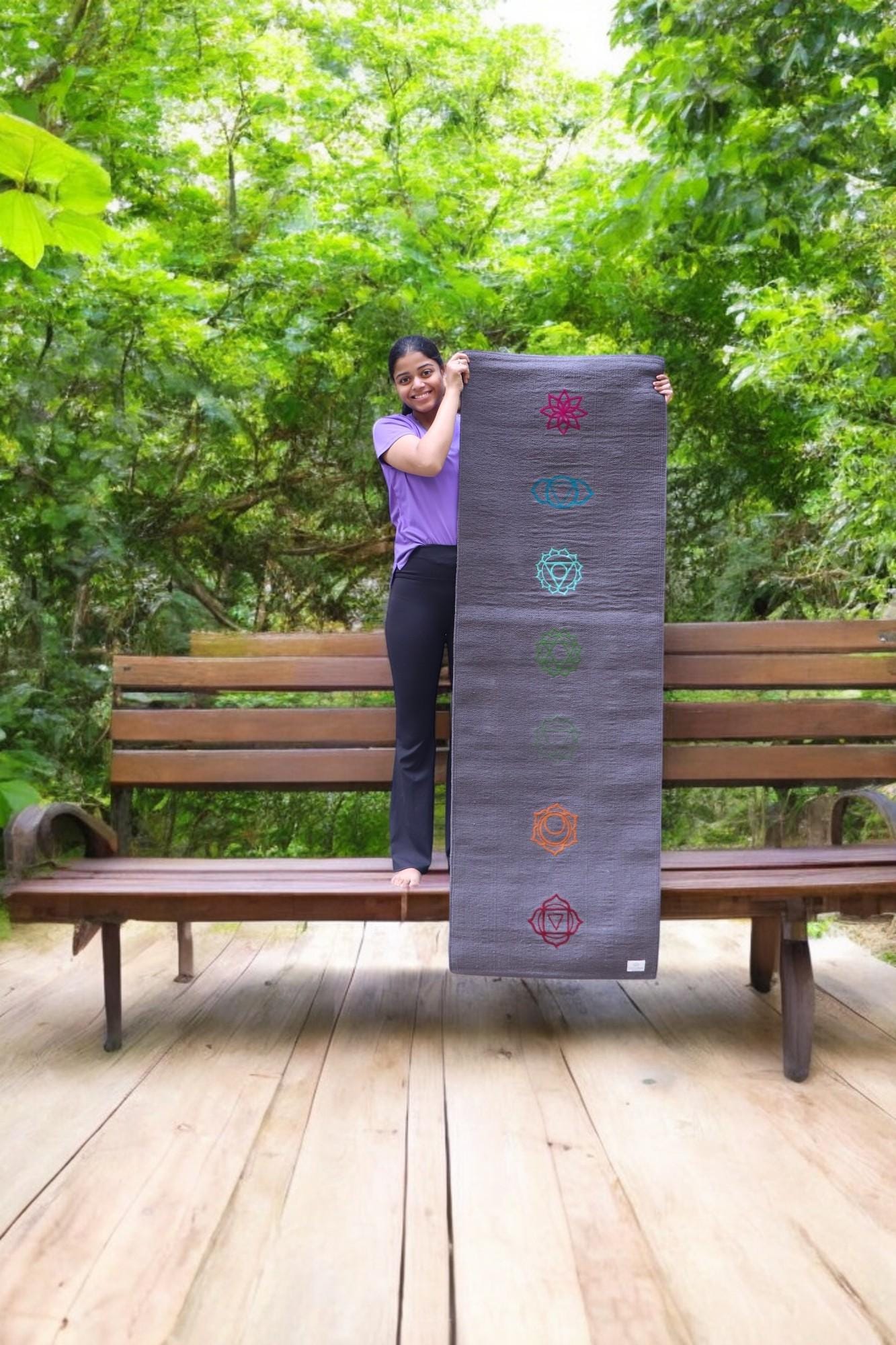 Grey Chakra Yoga Mat — Handwoven Organic Cotton with Yellow Base & 7 Chakra Symbols |